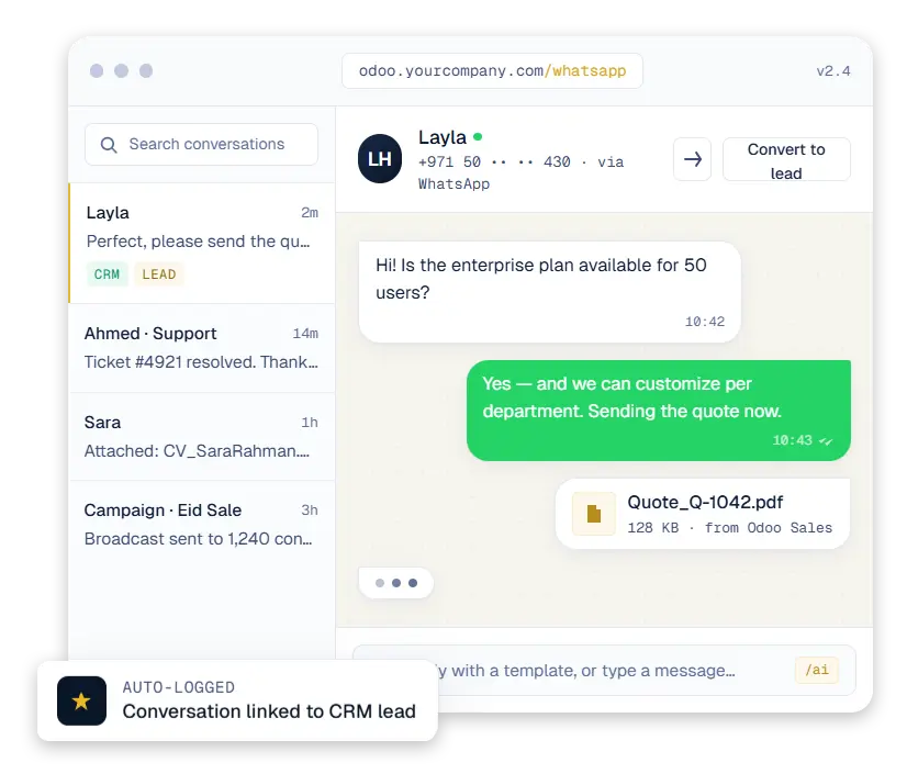 Monozoro brings Twilio-powered WhatsApp conversations straight into Odoo — so sales, support, HR, and operations finally share one inbox, one timeline, one source of truth.